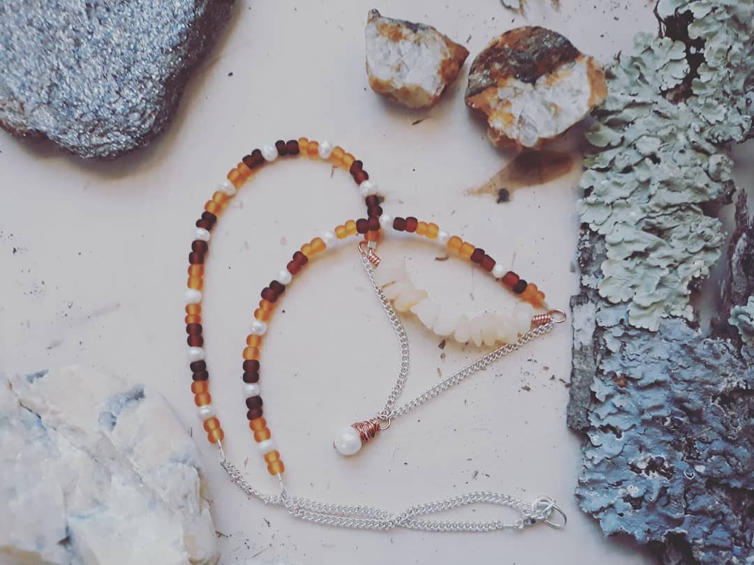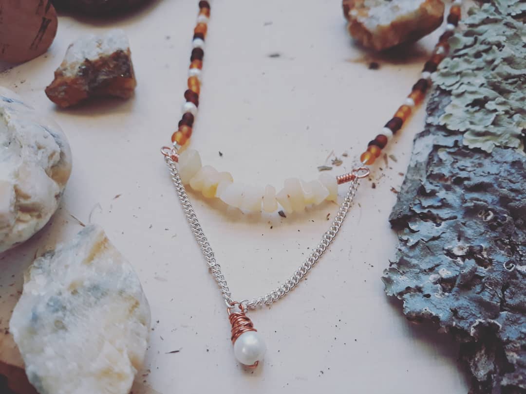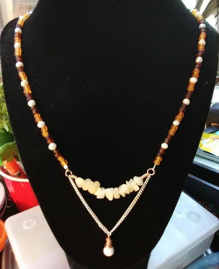 Earthy tumbled glass beads, Butter Quartz, Freshwater Pearl plunging hippie mama necklace