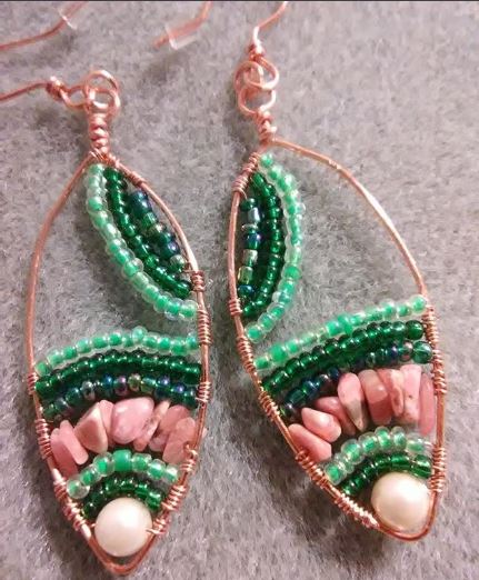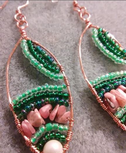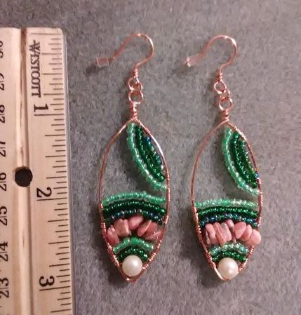 100% handmade copper mini tapestries on handmade copper ear wires. The Argentina Rhodochrosite is lovely in contrast with green glass gem beads. Made with Love and Magic.