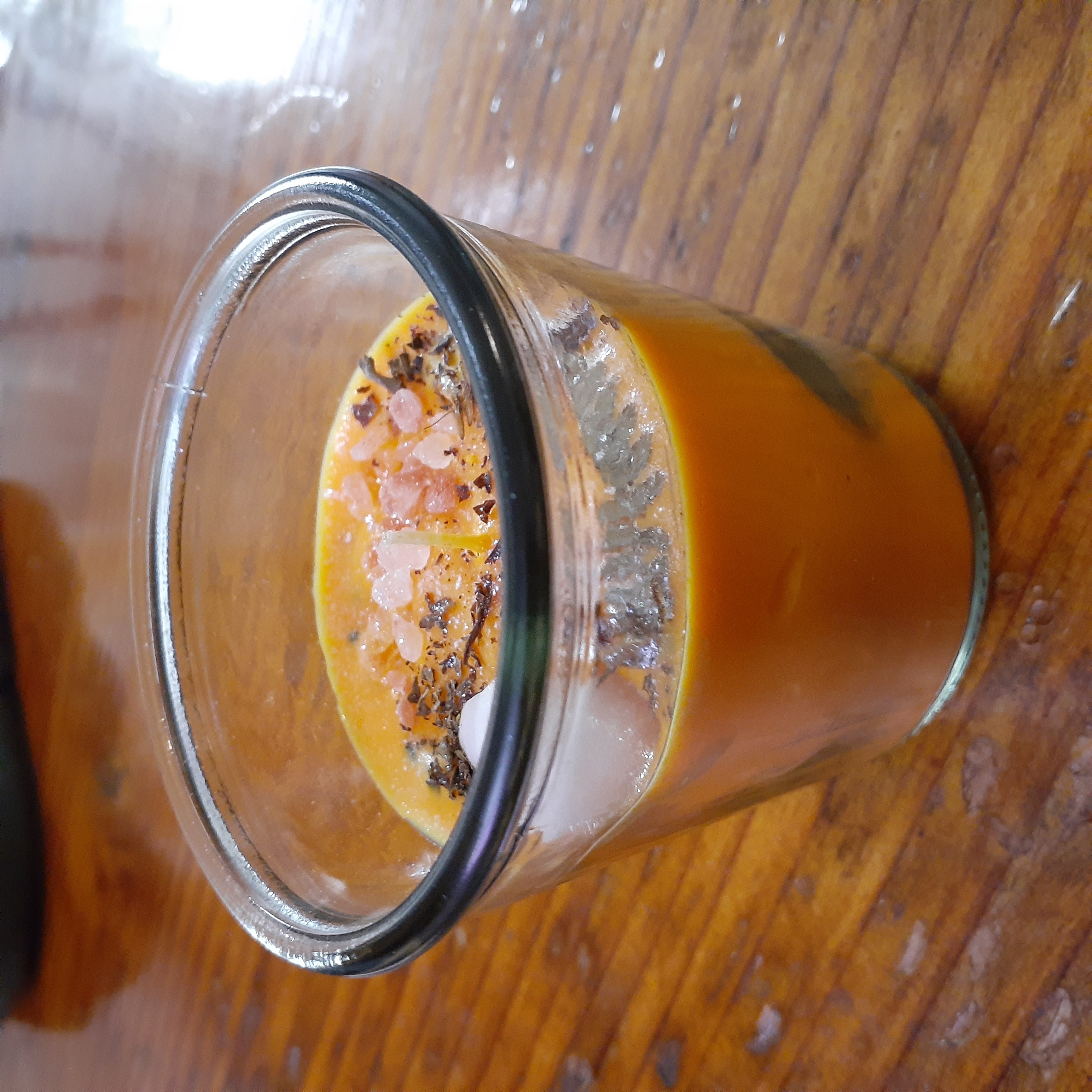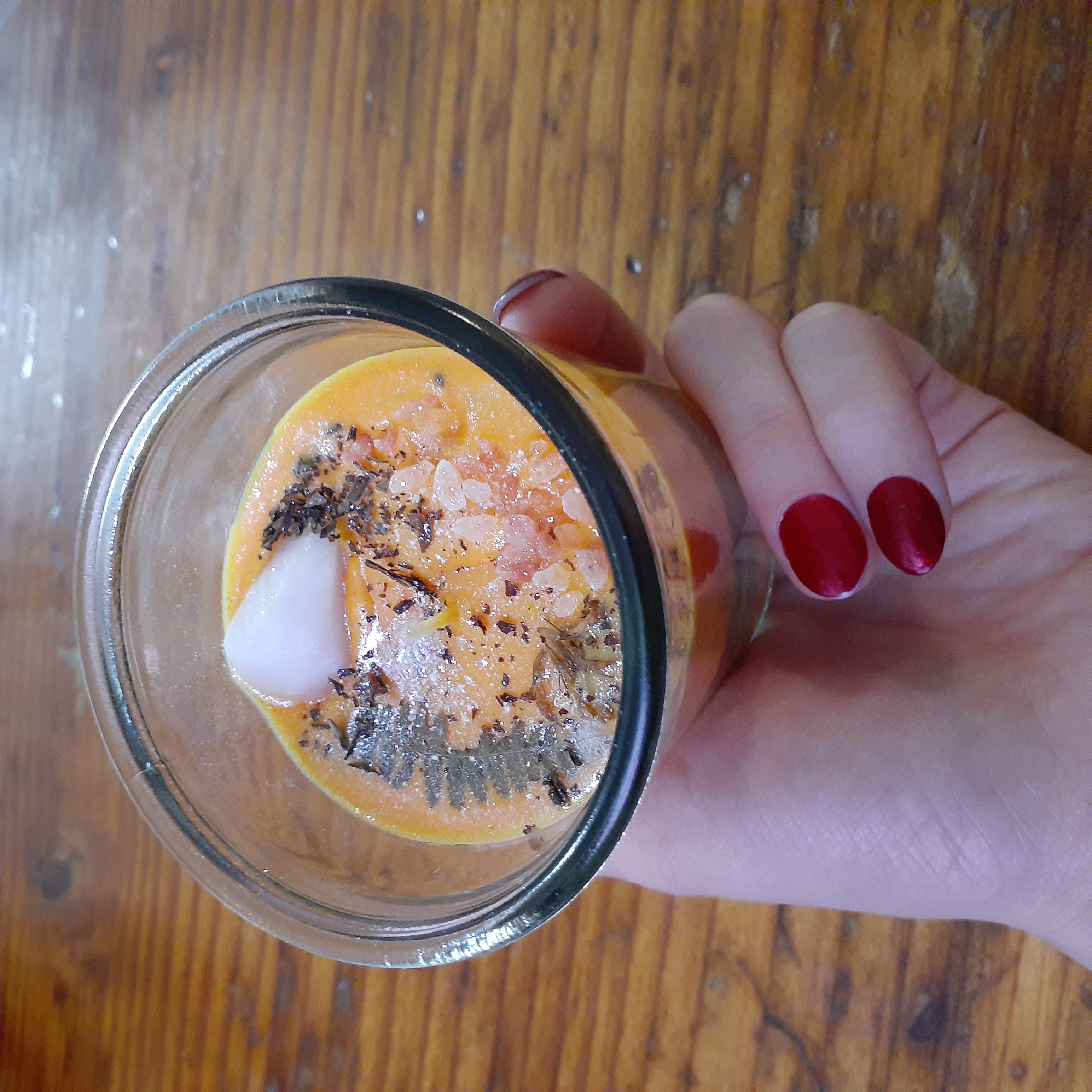 ✮ Candle contains: 1 natural new england quartz, himalayan salts, dried/pressed Boston ferns and clover from my personal collection, basil, and topped with glittery mica.